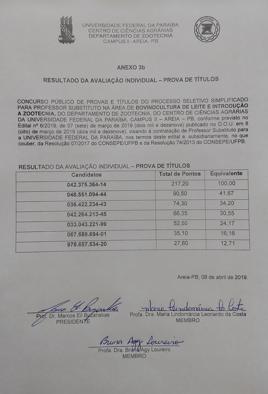 Resultado da Prova de Títulos - Concurso de Bovinocultura de Leite e Introdução à Zootecnia