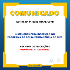 EDITAL Nº 11/2023 PRAPE/UFPB - INSTRUÇÕES PARA INSCRIÇÃO NO PROGRAMA DE BOLSA PERMANÊNCIA DO MEC