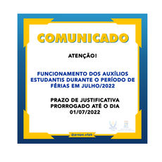 COMUNICADO Nº 17/2022 FUNCIONAMENTO DOS AUXÍLIOS ESTUDANTIS DURANTE O PERÍODO DE FÉRIAS (PERÍODO LETIVO 2021.2) – JULHO/2022 (republicado)