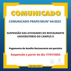 COMUNICADO PRAPE/SRUNº 04/2023 - SUSPENSÃO DAS ATIVIDADES DO RESTAURANTE UNIVERSITÁRIO DO CAMPUS II