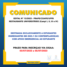 Este edital contemplará estudantes ingressantes no semestre letivo em 2023.1, ou discentes já contemplados com o Apoio Emergencial ao Estudante, conforme quadro de vagas e critérios deste Edital. As inscrições ocorrerão no período de 03/07/2023 a 07/07/2023, de acordo com as normas e condições estabelecidas neste Edital, que está publicado no sítio eletrônico http://www.ufpb.br/prape, bem como outras publicações e normatizações dele decorrentes.