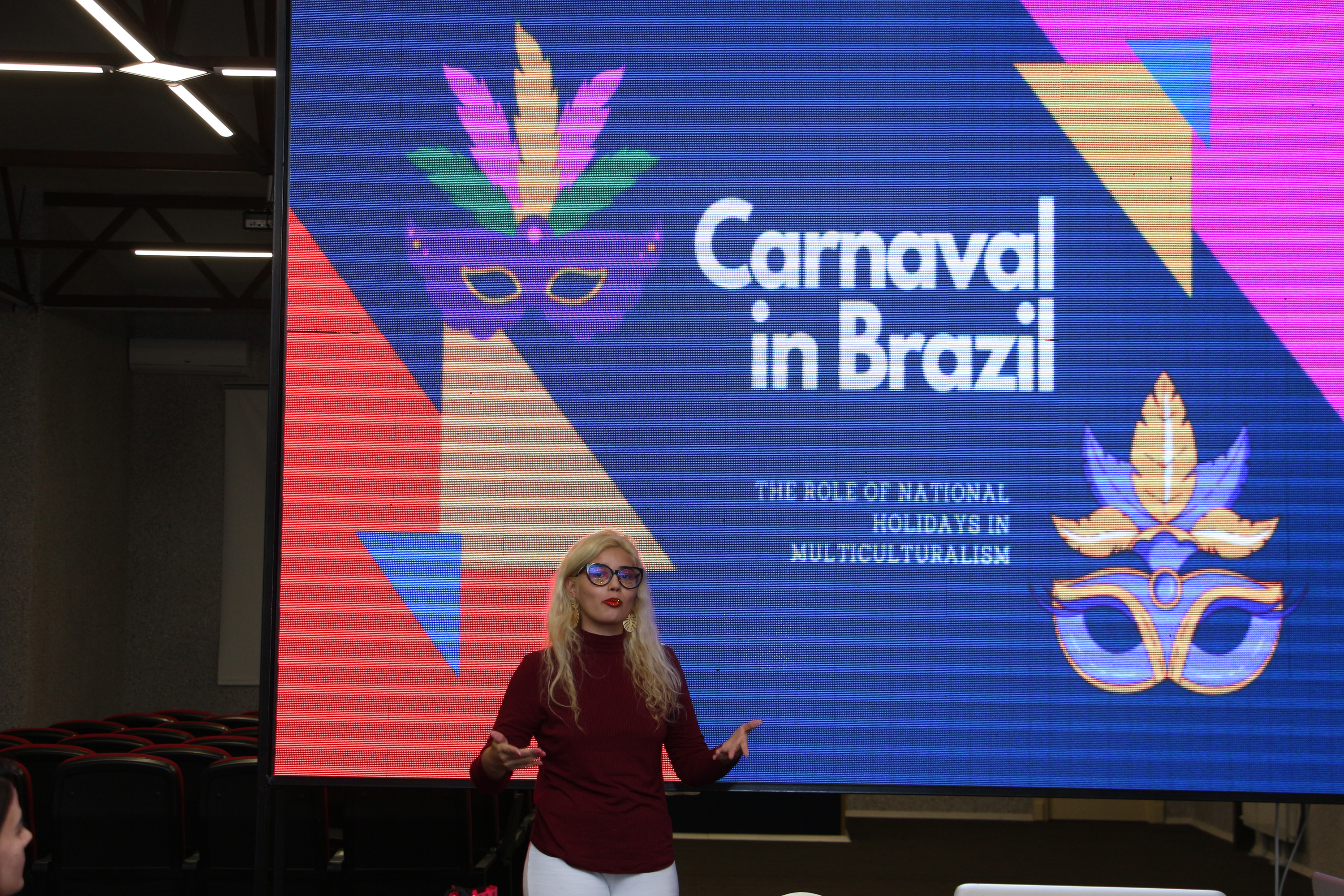 Além disso, cada participante internacional apresenta uma palestra sobre um tema multicultural do seu país e, como a visita foi justamente no período do Carnaval, esse foi o tema escolhido por Hanna. “Eu quis mostrar o carnaval de uma forma mais aprofundada, pois normalmente os estrangeiros só conhecem as escolas de samba e o Rio de Janeiro. Eu apresentei o frevo, o maracatu e as raízes históricas do samba, como ele surgiu como um movimento de resistência dos negros. Tentei mostrar o nosso Carnaval de uma perspectiva realmente multicultural”, contou a estudante. Ela disse ainda que seus colegas se animaram e se envolveram muito com a sua apresentação, pois ela levou alguns adereços típicos como glitter para maquiagem e uma sombrinha de frevo. “Um colega búlgaro e um azerbaijano até arriscaram uns passos de frevo e as meninas gostaram de fazer uma maquiagem bem colorida. Foi bem divertido”, completou Hanna.