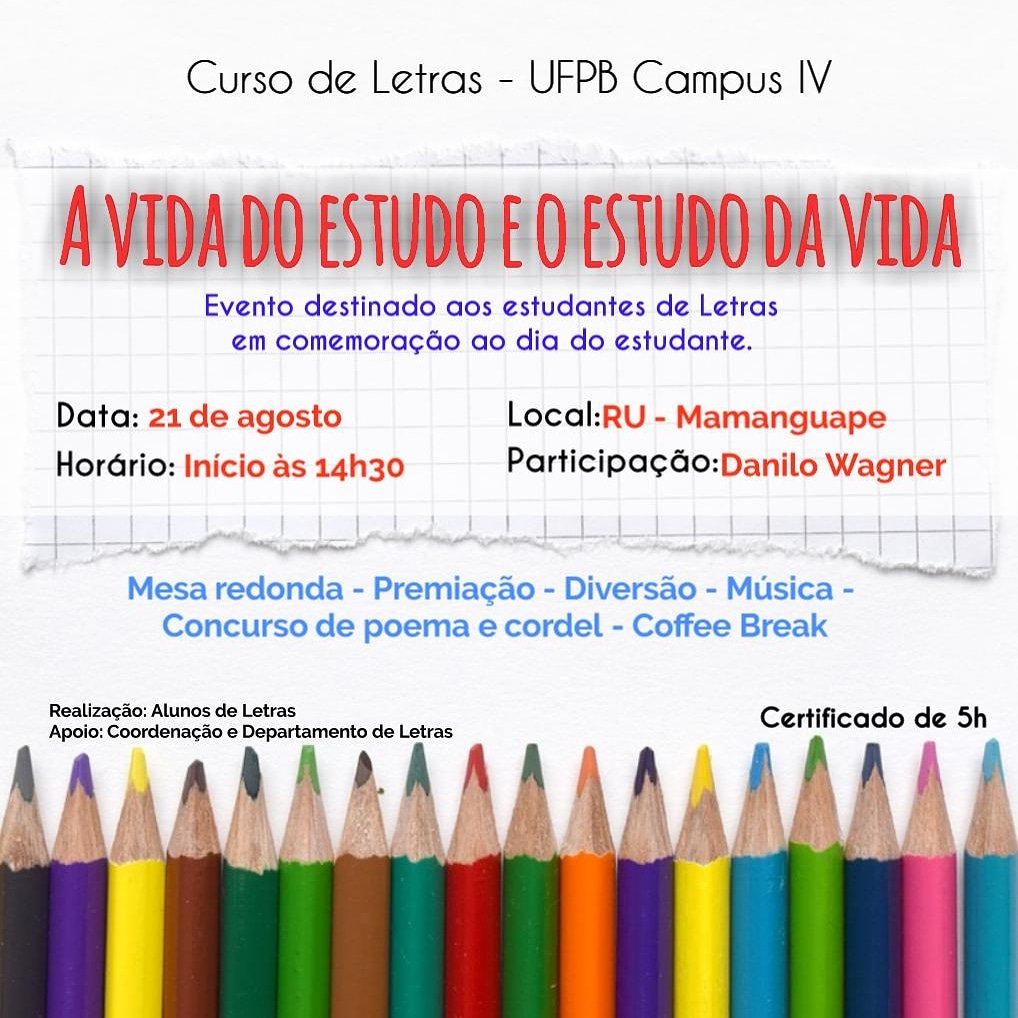 Estudantes do Curso de Letras do CCAE, organizam encontro com a Temática A vida do Estudo e o Estudo da Vida, ocorrerá no dia 21 de agosto de 2019, às 14:30 horas no RU em Mamanguape e contará com a participação de Danilo Wagner, aos participantes do evento será concedido certificado de 5h.