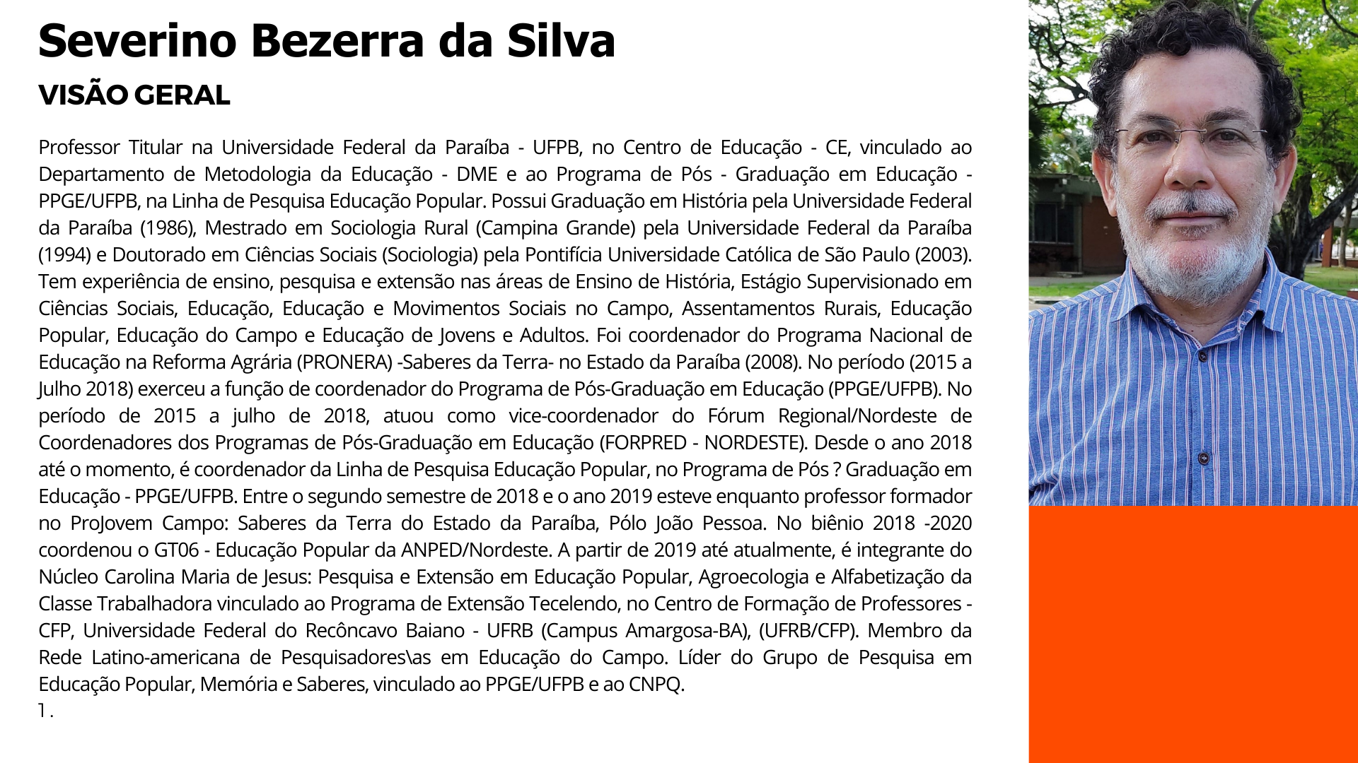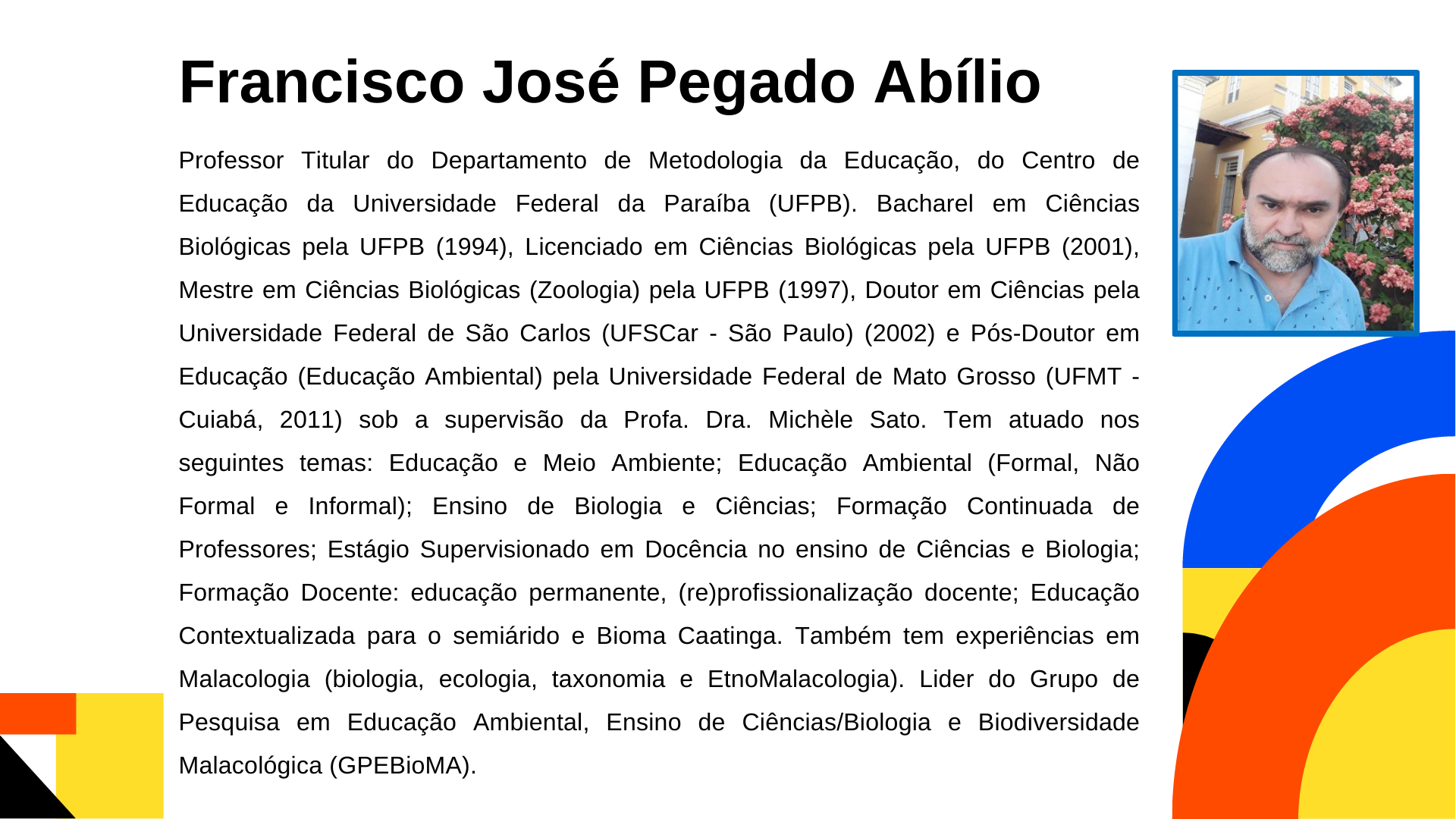 - Áreas de Interesse: Formação inicial e permanente de professores para a EJA, metodologias e práticas educativas dos movimentos sociais (campo, gênero, LGBTs e étnico-raciais) e discentes da EJA.