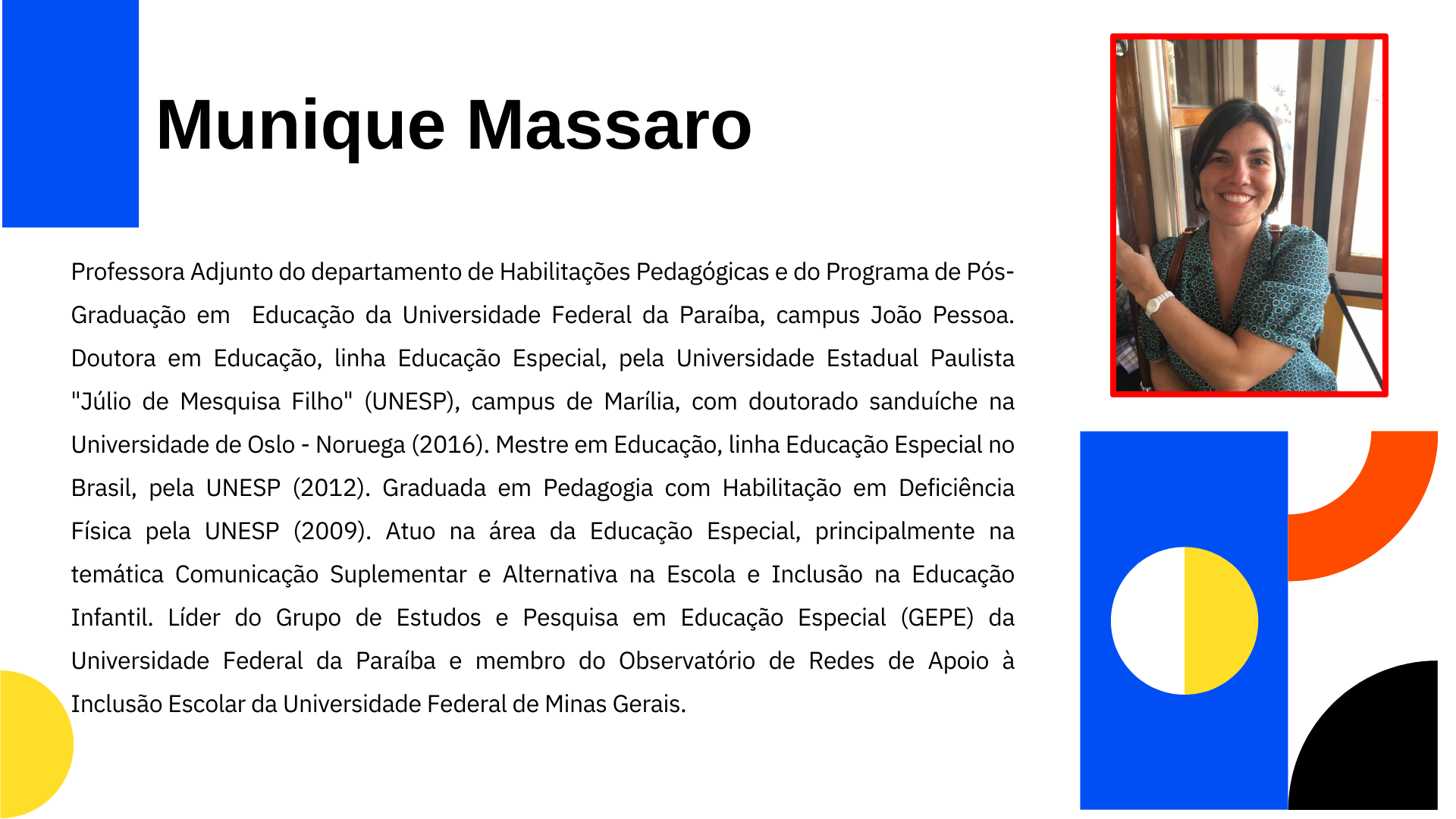- Áreas de interesse: Comunicação Suplementar e Alternativa; Métodos, Recursos e Estratégias de ensino com comunicação suplementar e alternativa para crianças com deficiência na Educação Infantil e séries iniciais do Ensino Fundamental. Desenvolvimento da linguagem de crianças usuárias de comunicação suplementar e alternativa e processos de ensino-aprendizagem.
