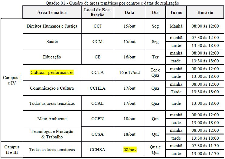 O XIX ENEX acontecerá no período de 15 a 19 de outubro nos campi João Pessoa (I) e Litoral Norte (IV) e no dia 8 de novembro nos campi Areia (II) e Bananeiras (III). Coordenadores de projetos e programas de extensão dos campi I e IV terão de 03 a 24 de setembro de 2018 para submissão on-line de trabalhos, mediante envio dos resumos pelo SIGeventos anexados em formato .PDF. Para os campi II e III, o período para submissão vai de 10 de setembro a 15 de outubro de 2018.