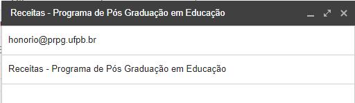 Enviar a planilha preenchida para o endereço eletrônico honorio@prpg.ufpb.br com assunto "Receitas - Nome do programa por extenso", vide exemplo.