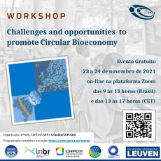 O Workshop “Challenges and opportunities to promote Circular Bioeconomy” acontece on-line na plataforma Zoom, nos dias 23 e 24 de novembro de 2021, das 9 às 13 horas (Brasil) e das 13 às 17 horas (CET).