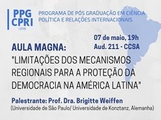 A professora alemã Dra. Brigitte Weiffen vai ministrar a aula magna "Limitações dos Mecanismos Regionais de Proteção à Democracia na América Latina" no dia 7 de maio, às 19h, no auditório 211, do Centro de Ciências Sociais Aplicadas da Universidade Federal da Paraíba (CCSA/UFPB), Campus I. Esta aula magna inicia as atividades do Programa de Pós-Graduação em Ciência Política e Relações Internacionais do Centro de Ciências Humanas, Letras e Artes (PPGCPRI/CCHLA) da UFPB.