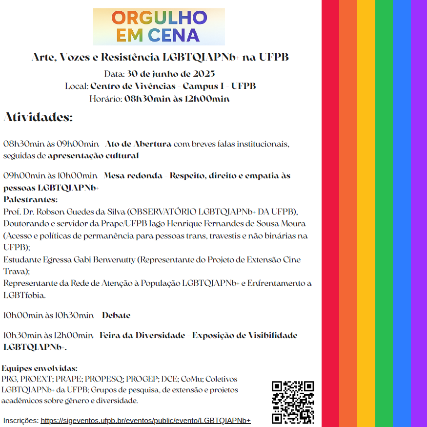 UFPB promove evento “Orgulho em Cena: Arte, Vozes e Resistência LGBTQIAPNb+”