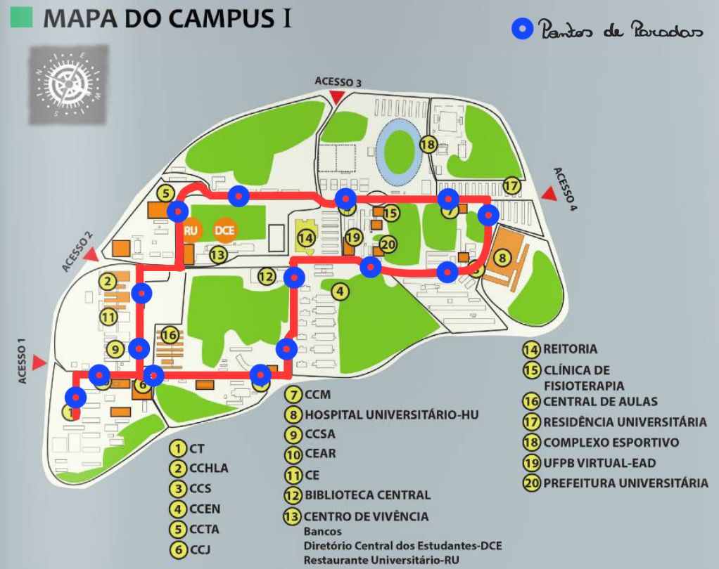 Partindo do Campus I, no bairro de Castelo Branco, para a unidade de Mangabeira, onde estão localizados o Centro de Informática (CI) e Centro de Tecnologia e Desenvolvimento Regional (CTDR), o circular realiza 04 viagens por dia, para transportar alunos no início e no final de cada período de aula.